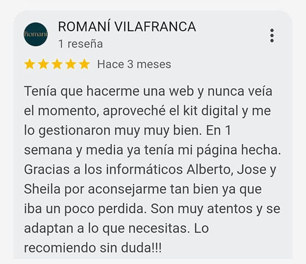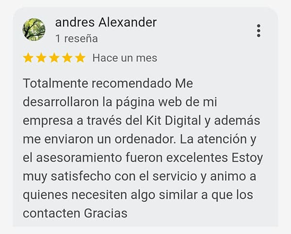 ✓ Presencia profesional en Google Maps:Creamos o mejoramos tu ficha de Google Business para que tu negocio aparezca correctamente en las búsquedas y en Google Maps. Tus clientes te encontrarán fácil y con buena impresión desde el primer vistazo.✓ Web tipo escaparate incluida:Incluimos una página web sencilla y profesional, si lo precisas, integrada en tu ficha. Mostrará tus datos clave, servicios principales, fotos, ubicación, formulario de contacto y llamada directa.✓ Fotos, textos y datos optimizados:Nos encargamos de subir y configurar todo: fotos del negocio, horarios, teléfono, enlaces y una descripción optimizada que aumente tu visibilidad local.✓ Gestión de reseñas durante 12 meses:Durante un año completo, gestionamos por ti las reseñas: respondemos a tus clientes, cuidamos tu reputación online y fomentamos opiniones positivas.✓ Aumento de visibilidad local:Con toda la ficha optimizada, aumentamos tu posición en las búsquedas de Google para que te encuentren más fácilmente en tu zona o sector.✓ Servicio completo, sin esfuerzo para ti:Nosotros lo activamos y lo gestionamos todo por ti. No tienes que hacer nada, solo elegir este servicio con tu Kit Digital.✓ 12 meses incluidos. Después, todo es 100 % tuyo:Este servicio cubre 12 meses completos de configuración y gestión profesional. Pasado ese tiempo, tú decides: puedes seguir gestionándola tú mismo, contratar a una agencia o dejarla activa sin cambios. La ficha te pertenece al 100 %.